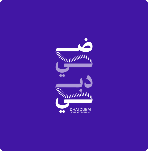Dhai Dubai Light Art Festival centers around the Arabic name, elegantly arranged in a vertical layout spelling out Dhai Dubai. The design highlights kashidas to reflect the connection created between people and art through light. The elongation of kashidas artistically connects each letter through graphics inspired by cultural elements extracted from Mashrabiyas in Dubai. This approach vividly conveys the essence of art, light, and movement, infusing the brand mark with a distinctive and culturally resonant aesthetic and approach.